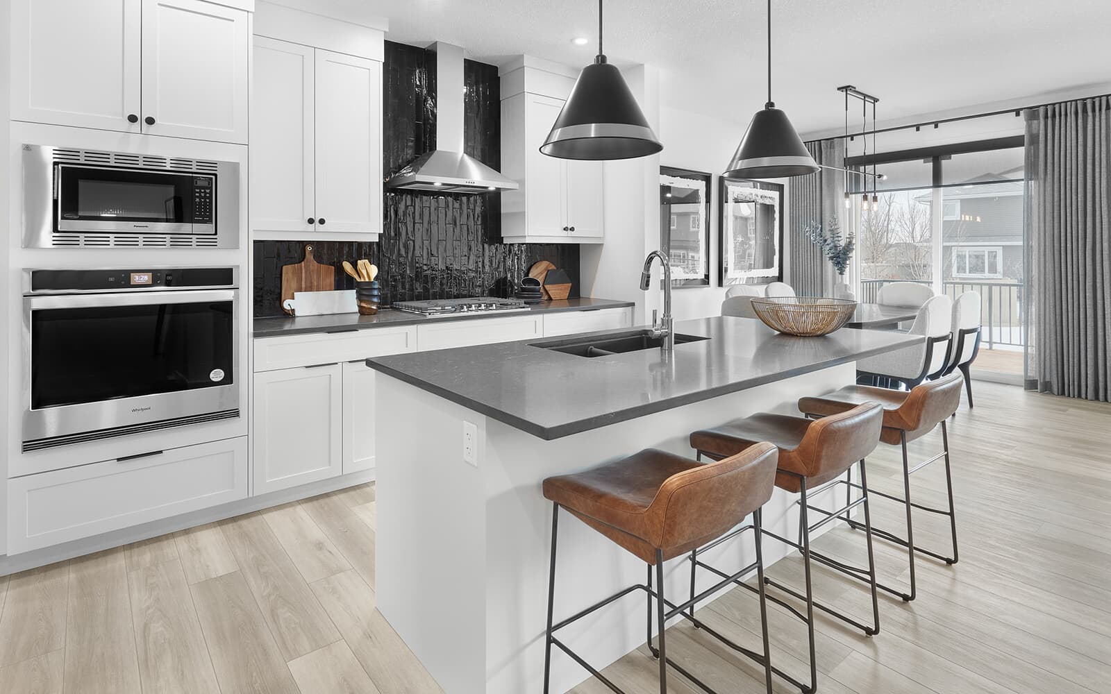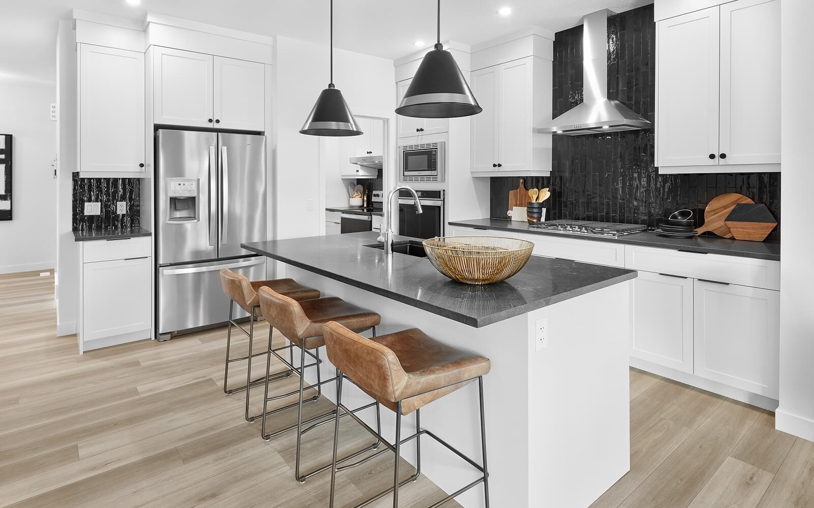 – Designer kitchen package including a chimney hood fan, French door fridge with internal ice and water, dishwasher, electric range, and built-in microwave